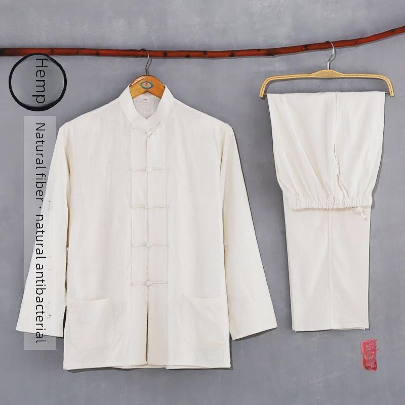 Мужской костюм Тан из хлопка и льна: Длинный рукав кардиган в китайском стиле Ханьфу из двух частей для людей среднего и пожилого возраста — купить товар онлайн с бесплатной доставкой по всему миру!