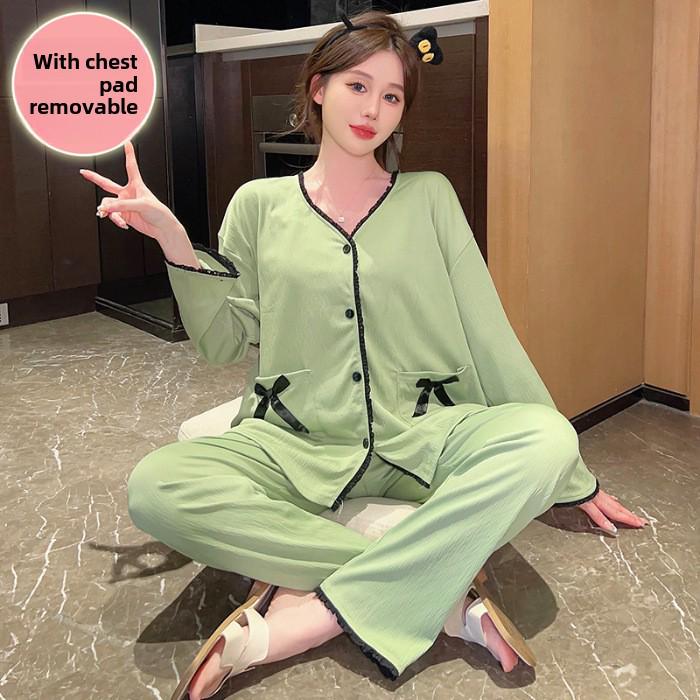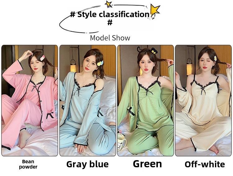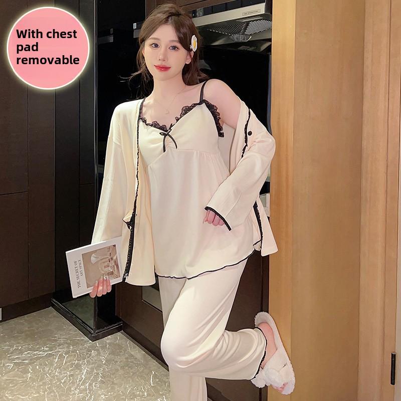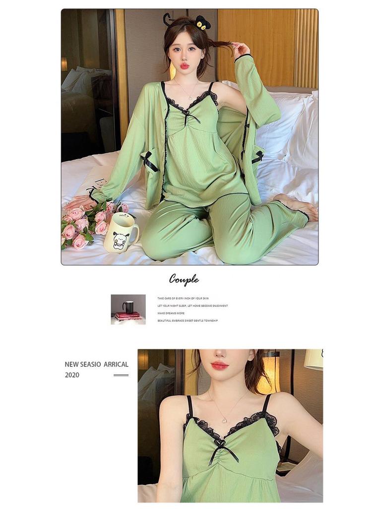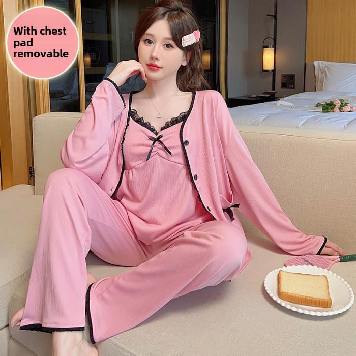 Почувствуйте максимальный комфорт и стиль с этим женским пижамным комплектом весна/осень. Комплект домашней одежды из трех предметов включает очаровательный топ с подвязками, дополненный удобными нагрудными подушечками для дополнительной поддержки.. В сочетании с длинными рукавами и удобными брюками этот комплект обеспечит комфортную посадку в межсезонье.. Изготовленный из высококачественного полиэстера, он имеет креповую текстуру, которая добавит нотку роскоши вашему отдыху.. Этот пижамный комплект, рассчитанный на людей больших размеров, выдерживает вес до 230 фунтов, что делает его идеальным выбором для самых разных типов телосложения, ищущих как элегантность, так и комфорт.