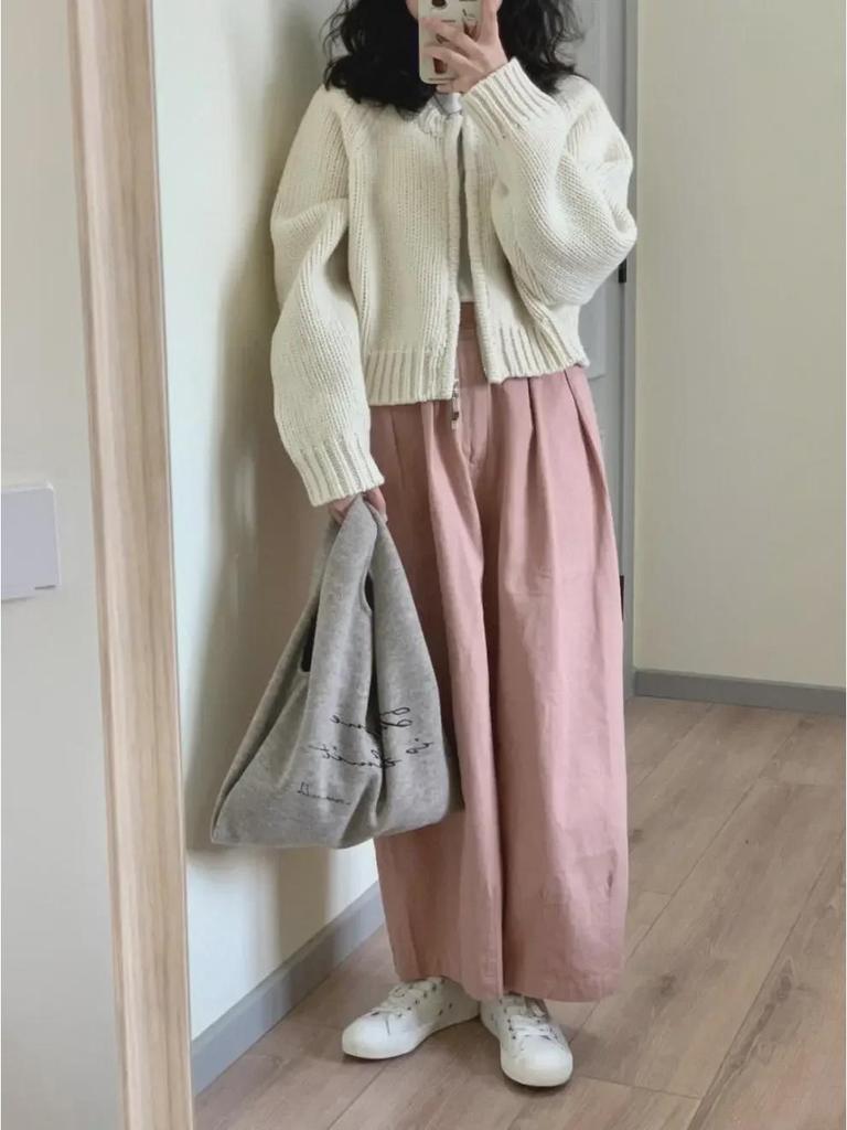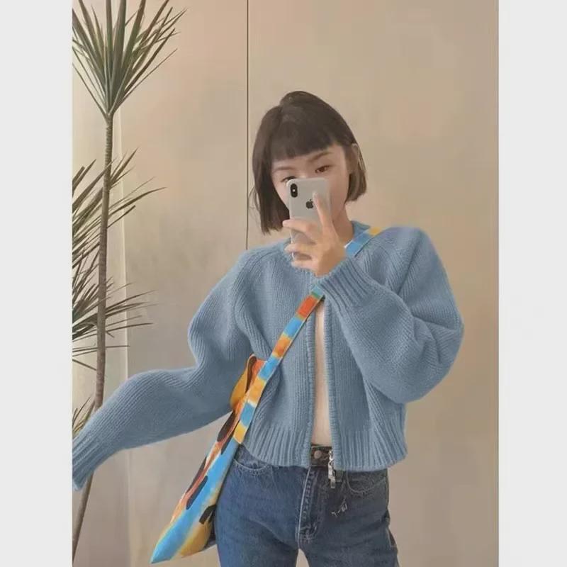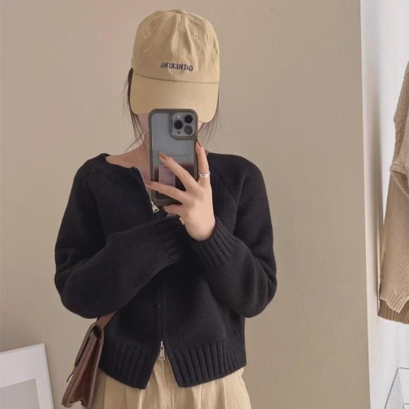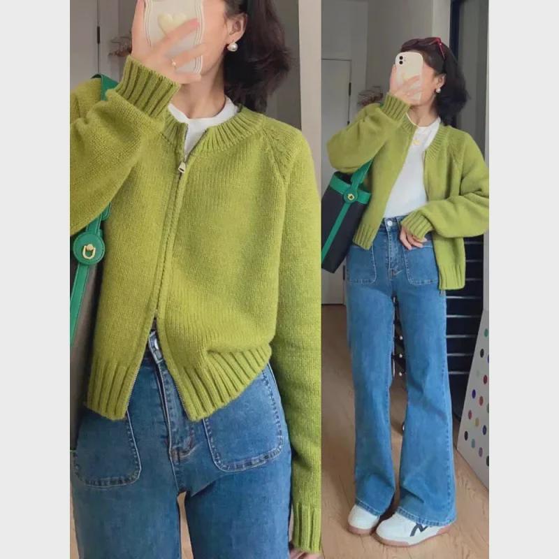 Корейский вязаный кардиган цвета авокадо с двойной молнией: Узкий, универсальный короткий свитер для женщин, идеально подходящий для многослойного ношения и подчеркивающий фигуру.