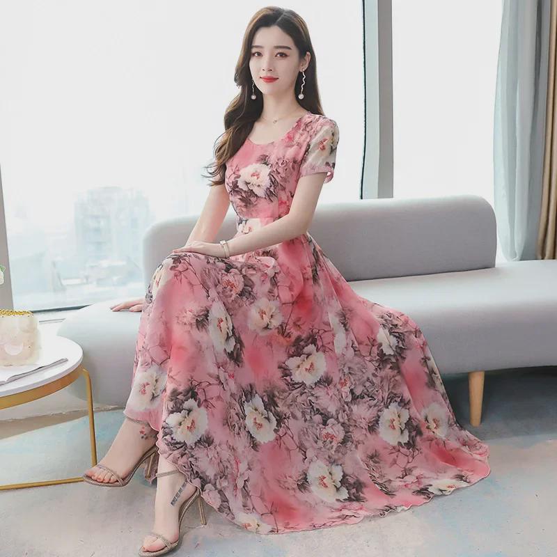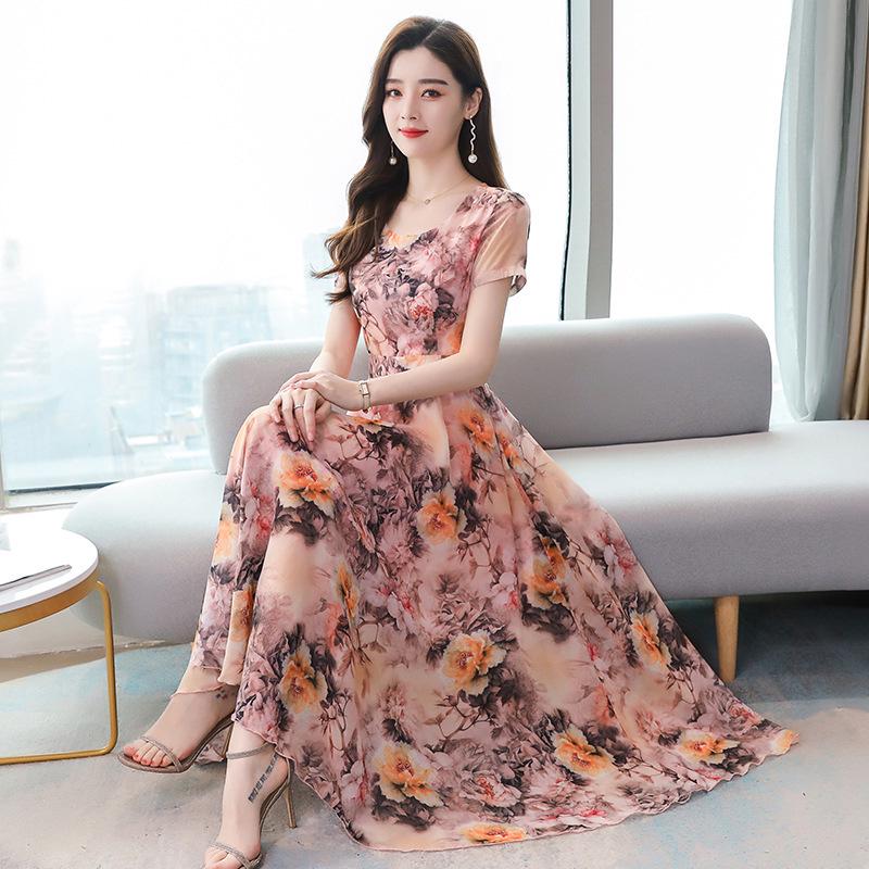 Элегантное платье-трапеция из шелка Ice Silk с юбкой-солнце — женское, лето 2020 г., с короткими рукавами, средней длины, с принтом, большой размер.