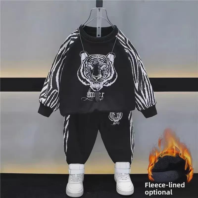 Зимний бархатный спортивный костюм для мальчиков 2023 г.: Стильный комплект из толстовки с круглым вырезом и спортивных штанов для детей