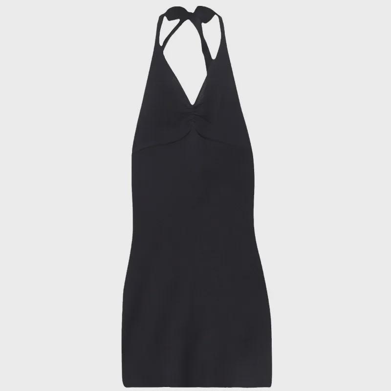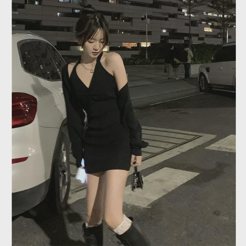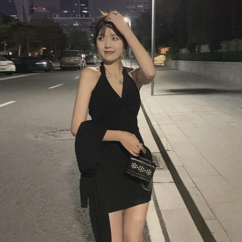 2024 Корейское стройнящее маленькое черное платье с бретелью через шею - сексуальный весенне-летний дизайн