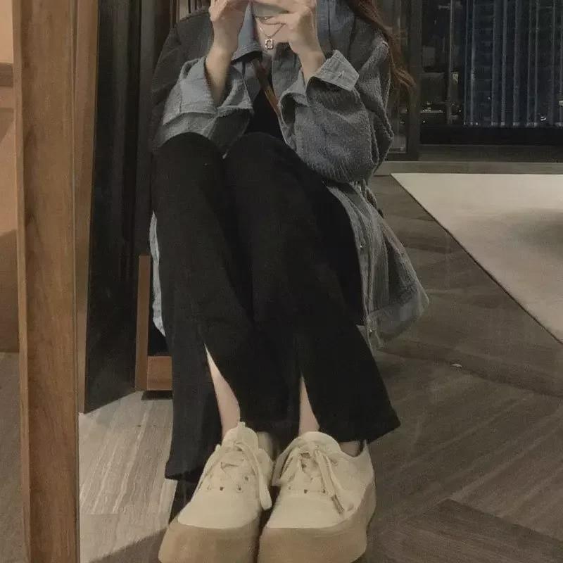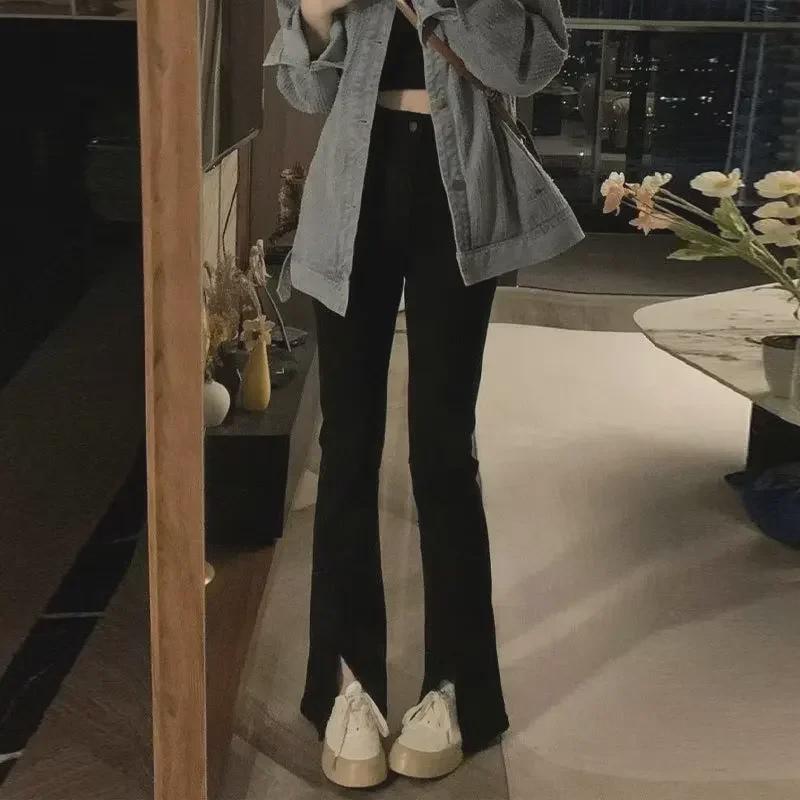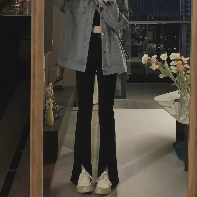 Женские черные облегающие джинсы с высокой талией и разрезом 2024 года