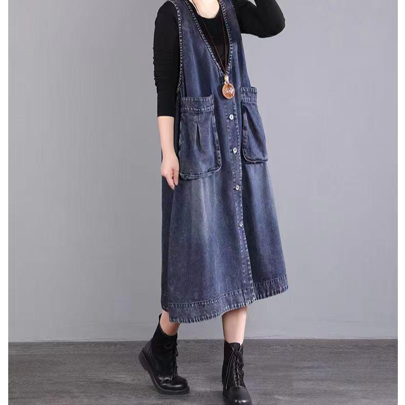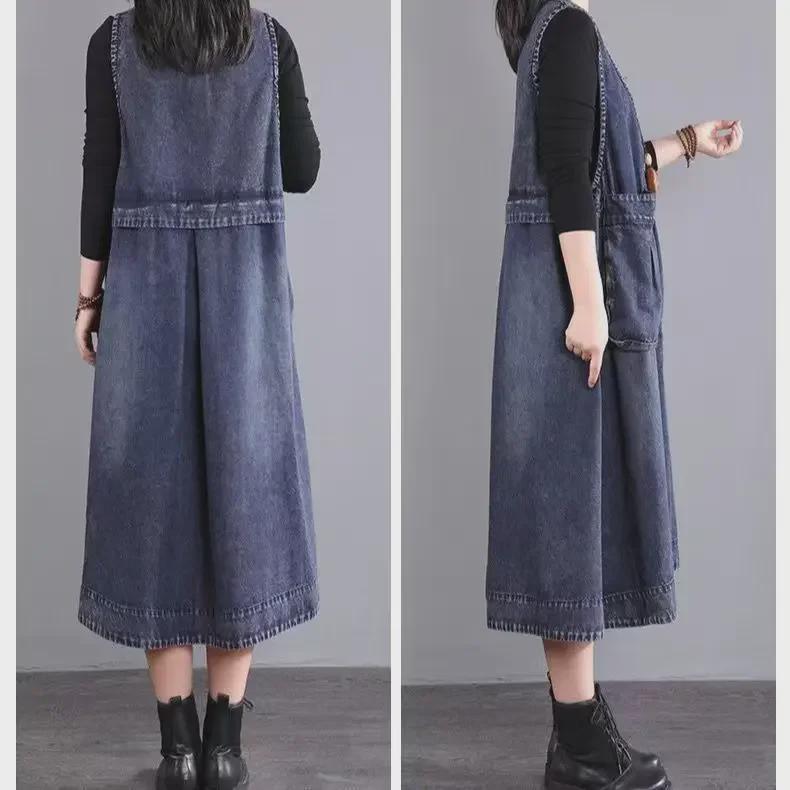 Платье-жилет свободного кроя из денима с большими карманами — корейский стиль средней длины на весну 2024 г.