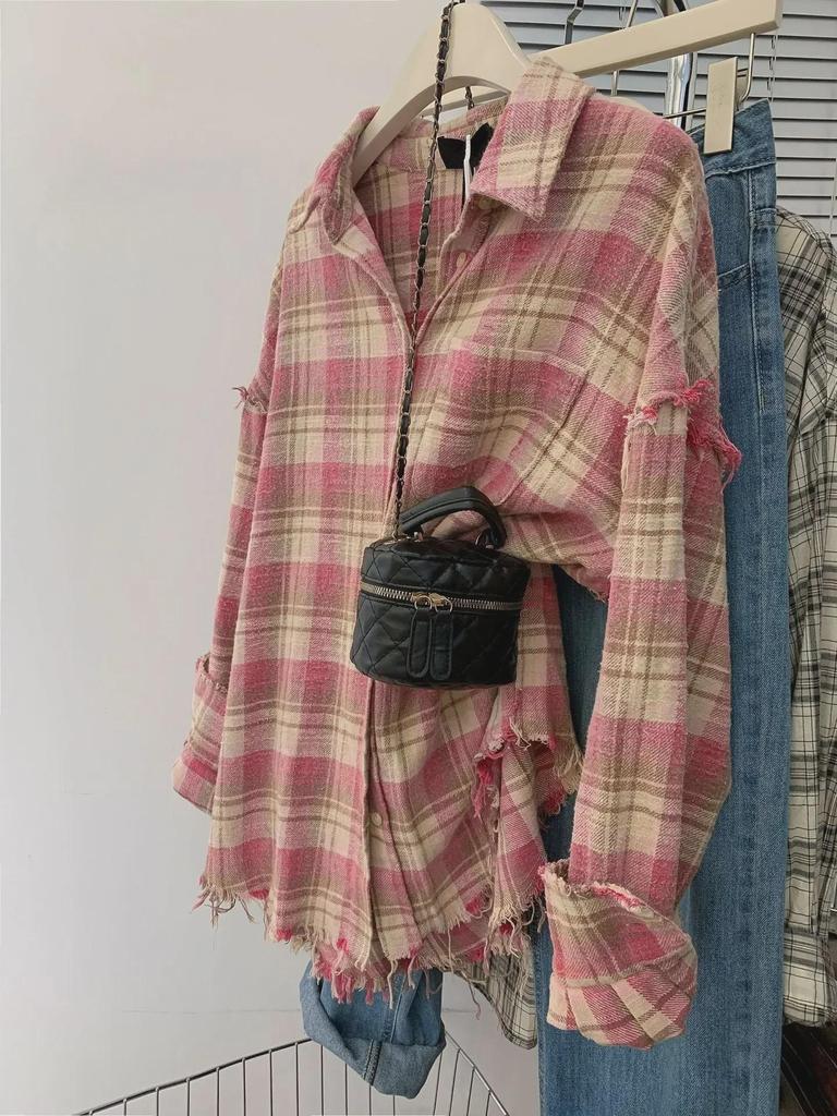 Женская куртка-рубашка в стиле ретро с длинными рукавами розового цвета в клетку — ленивый стиль на осень 2024/весну