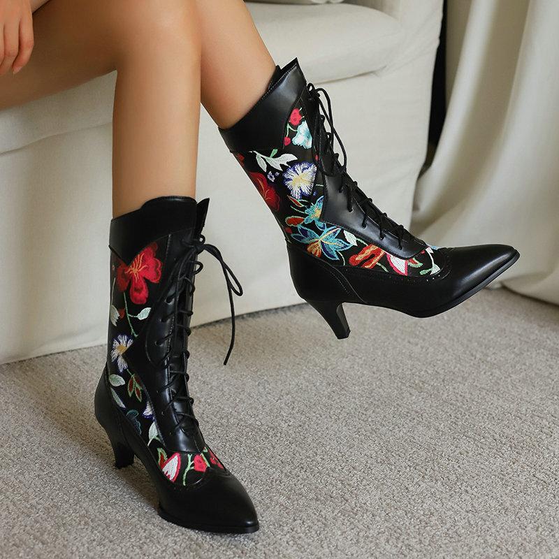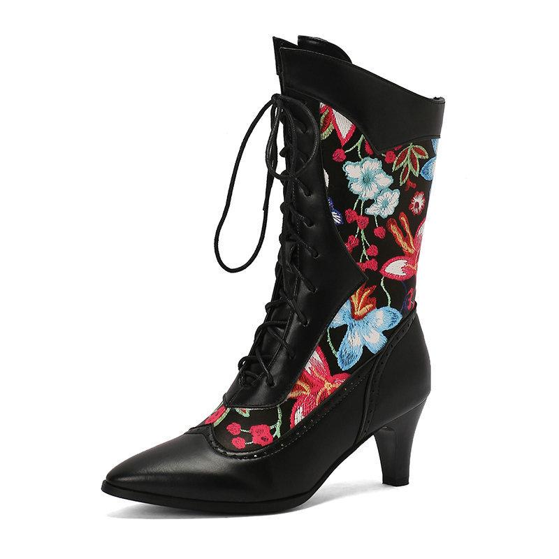 Новые женские сапоги средней длины из набивной ткани с острым толстым каблуком и ремешком спереди