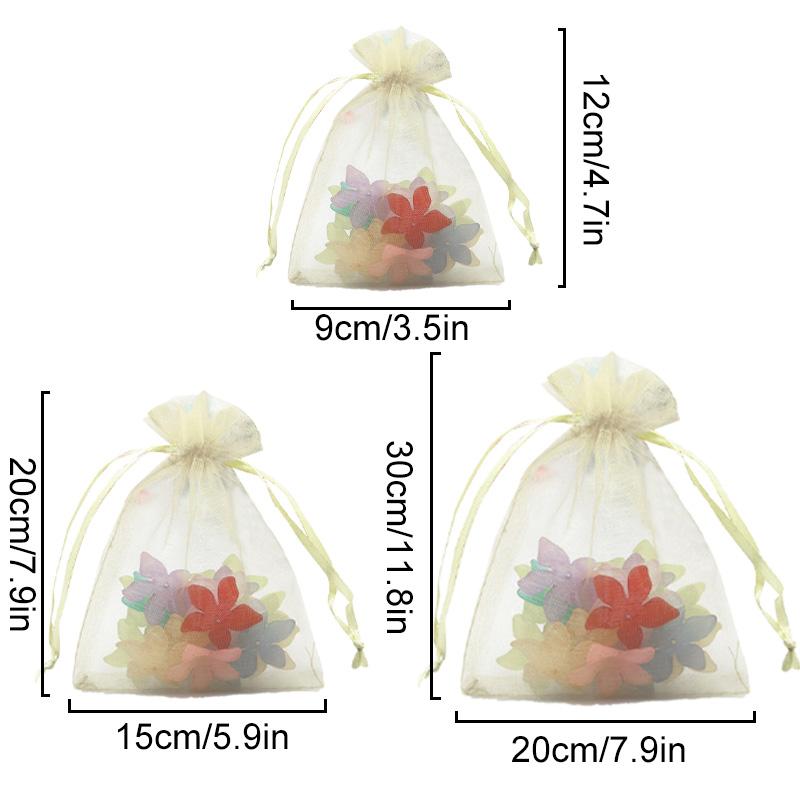 2. Широкий диапазон: Размер нашего мешочка на шнурке составляет приблизительно 7x9 см, 9x12 см, 10x15 см, его можно использовать для хранения ювелирных изделий или других мелочей, мыла ручной работы, конфет, небольших подарков, маленьких подарочных пакетиков, он идеально подходит для использования в качестве сувениров на вечеринку, свадьбу, шоу, детский душ, органзовых мешочков.