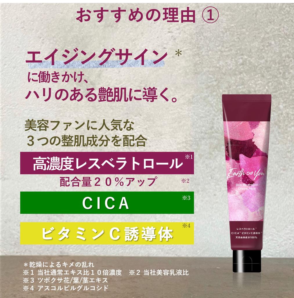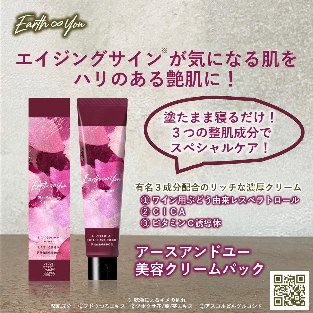 ``Earth and You Beauty Cream Pack'' Этот специальный продукт для ухода с насыщенным кремом и нежным ароматом можно использовать в качестве маски или крема, и он обязательно доставит удовольствие вашему разуму и коже.. Помогает сделать кожу с признаками старения* упругой и блестящей. Для использования в качестве маски под краску или ночной маски.. Для глаз и рта. В качестве кондиционирующего кожу ингредиента он содержит на 20% больше экстракта виноградной лозы, чем косметическая эмульсия, которая содержит высокую концентрацию *2 суперполифенола «ресвератрол», а также содержит ингредиенты «CICA *3» и «производное витамина С *4», которые популярны среди поклонников красоты.. ~Рекомендуемое применение~ После нанесения на кожу сначала сделайте глубокий вдох.. Наслаждайтесь ароматом натуральных эфирных масел, включая розовую герань, которая воздействует на женские гормоны✿ ◆ В качестве «ночной маски» ◆ Нанесите количество средства размером с Делавэр толстым слоем на все лицо, оберните его в ладони и с помощью нажатия руки вотрите его в кожу. Ложитесь спать и умывайтесь на следующее утро.. ◆ Как «крем» для области вокруг глаз и точечного ухода ◆ Рекомендуется как «крем для глаз» для проблемных зон, а также точечный уход за такими зонами, как носогубные складки. ※ Нарушение текстуры из-за сухости