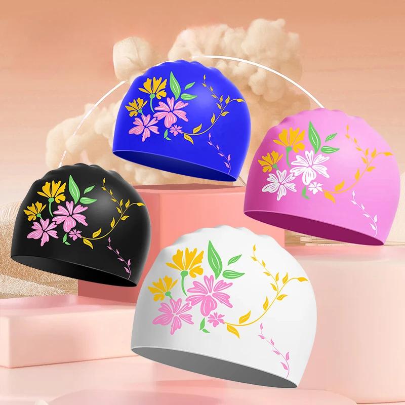 Шапочки для плавания с цветочным принтом для женщин, длинные волосы, защита ушей, шапочки для плавания для взрослых, удобные силиконовые шапочки для плавания, аксессуары для бассейна