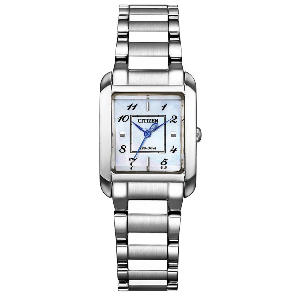 Citizen L Square Collection EW5600-87D — это женские часы от известного бренда Citizen. Эти часы оснащены японским солнечным кварцевым механизмом калибра B035, обеспечивающим точный ход.. Корпус изготовлен из нержавеющей стали и имеет квадратную форму, диаметром 21,5 мм и толщиной 7,5 мм.