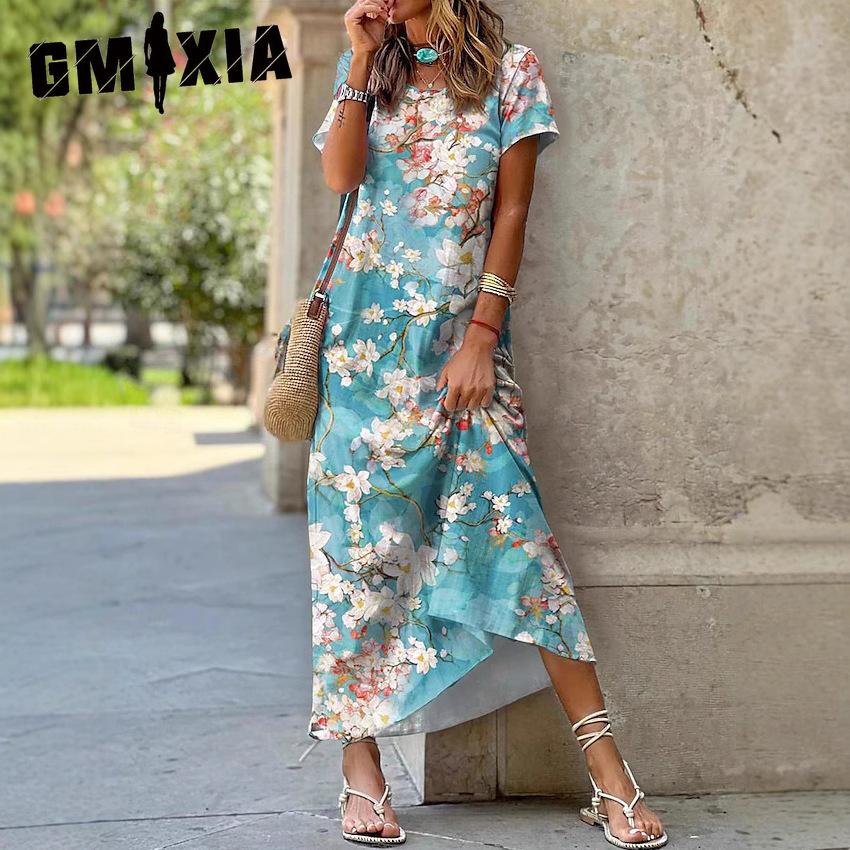 GMXIA Летние женские длинные платья с круглым вырезом и коротким рукавом с растительным цветочным принтом