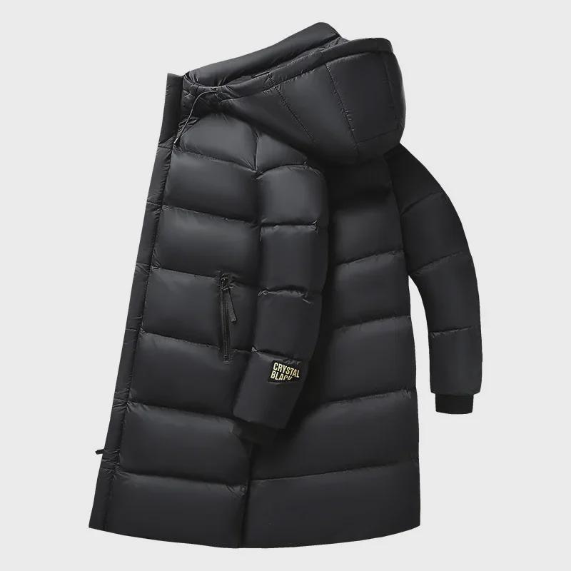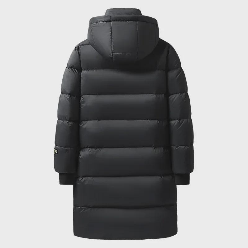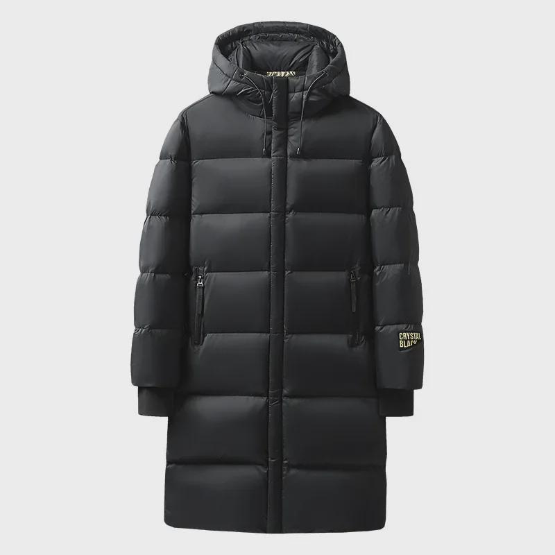 Длинный пуховик "National Standard" черного и золотого цвета - модный, с капюшоном и белым утиным пухом