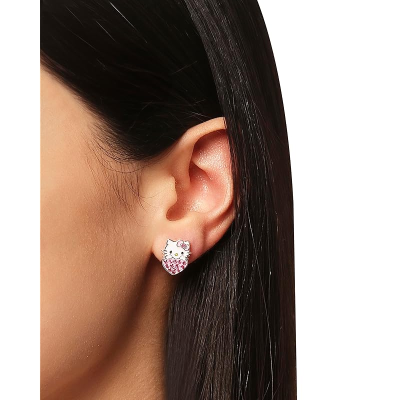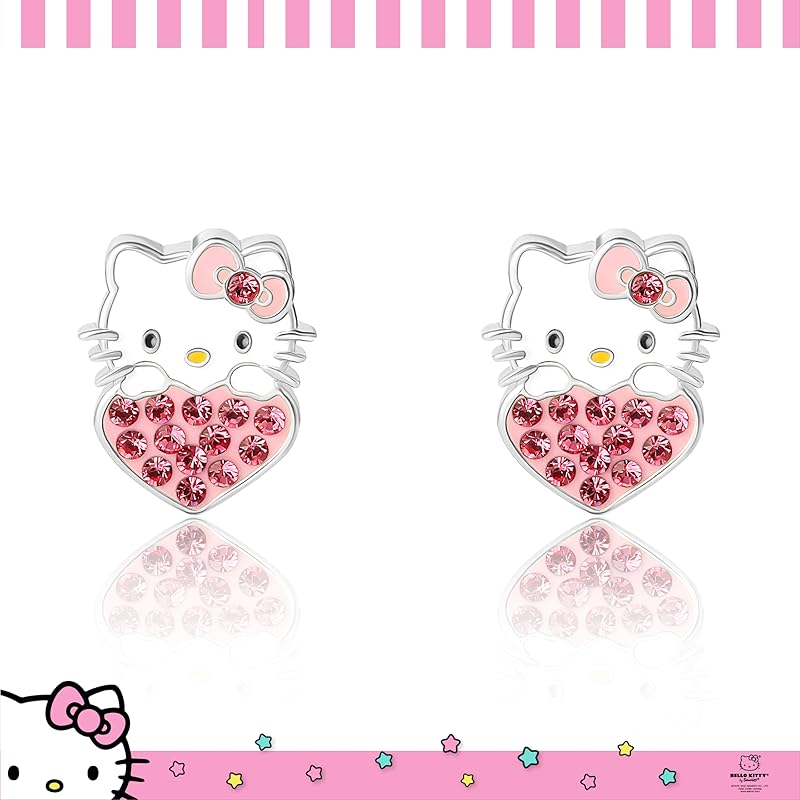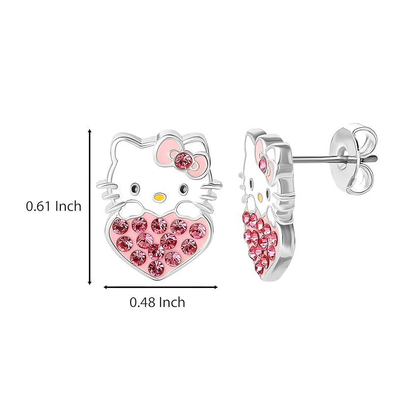 [Официально лицензированные серьги Hello Kitty] Яркие серьги-гвоздики с эмалевым покрытием, на которых изображена Hello Kitty, выглядывающая из-под розового сердца.. Сердце украшено кристаллами нежно-розового цвета, создающими стильный блеск.