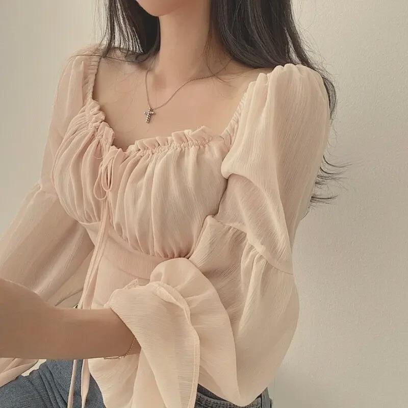 Высококачественная корейская шифоновая рубашка с квадратным воротником и рукавами-трубами для женщин