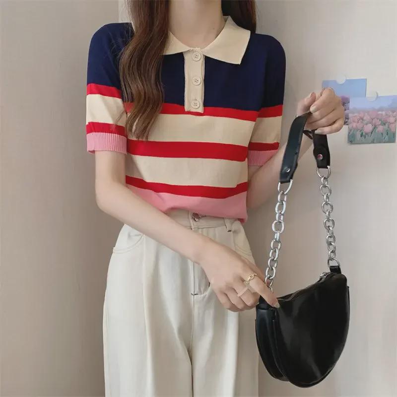 Женская трикотажная футболка с воротником поло в полоску - контрастный цвет, короткий рукав, облегающий крой, стильный, омолаживающий, универсальный летний топ — купить товар онлайн с бесплатной доставкой по всему миру!
