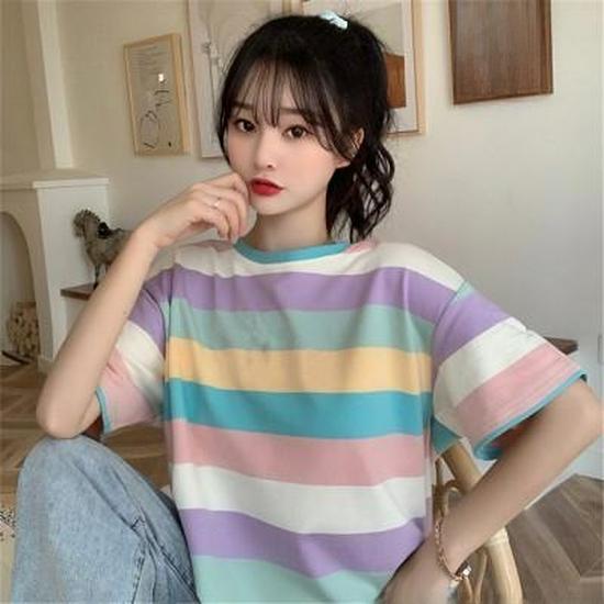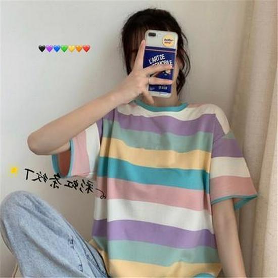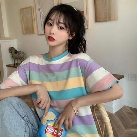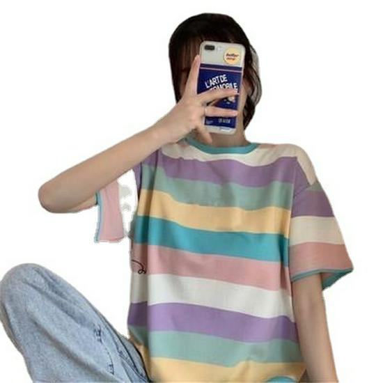 2021 Весна/Лето Корейская Радужная Повседневная Свободная Футболка С Короткими Рукавами Для Женщин - Трендовая Студенческая Мода