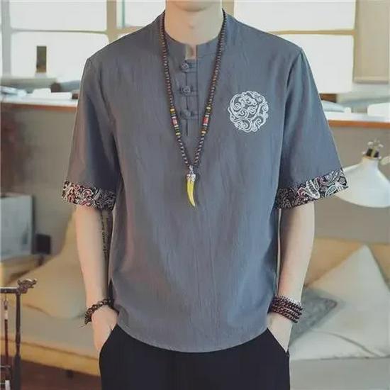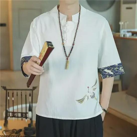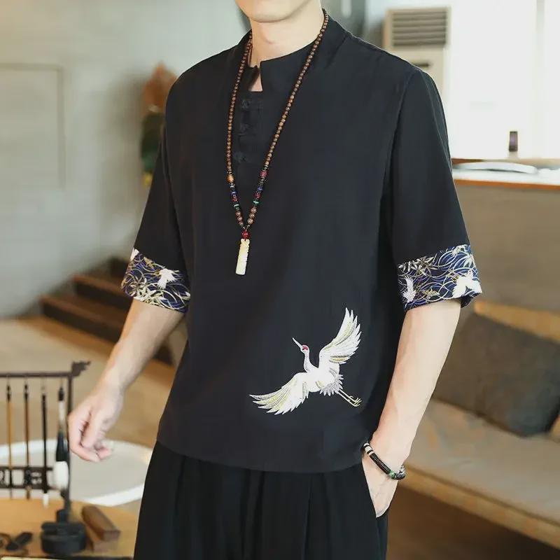 Мужская футболка с коротким рукавом из хлопка и льна с вышитым журавлем в китайском стиле