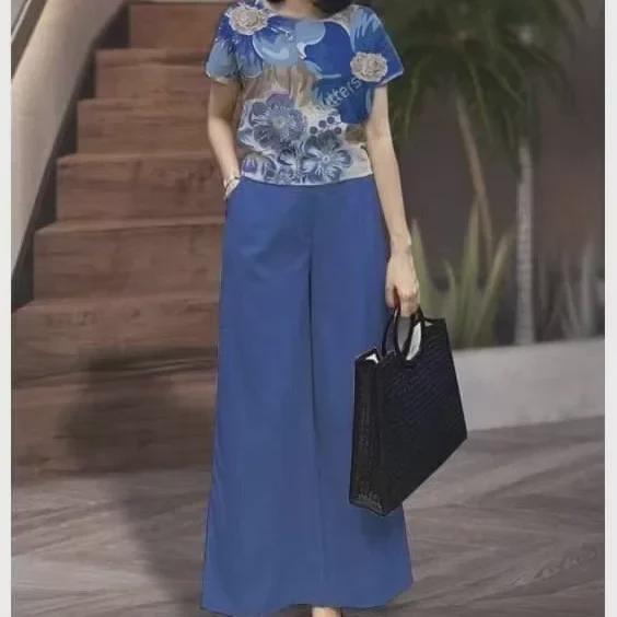 Женская летняя мода 2023 года: Однотонный свободный топ с короткими рукавами и напечатанные брюки, костюм из двух частей — купить товар онлайн с бесплатной доставкой по всему миру!