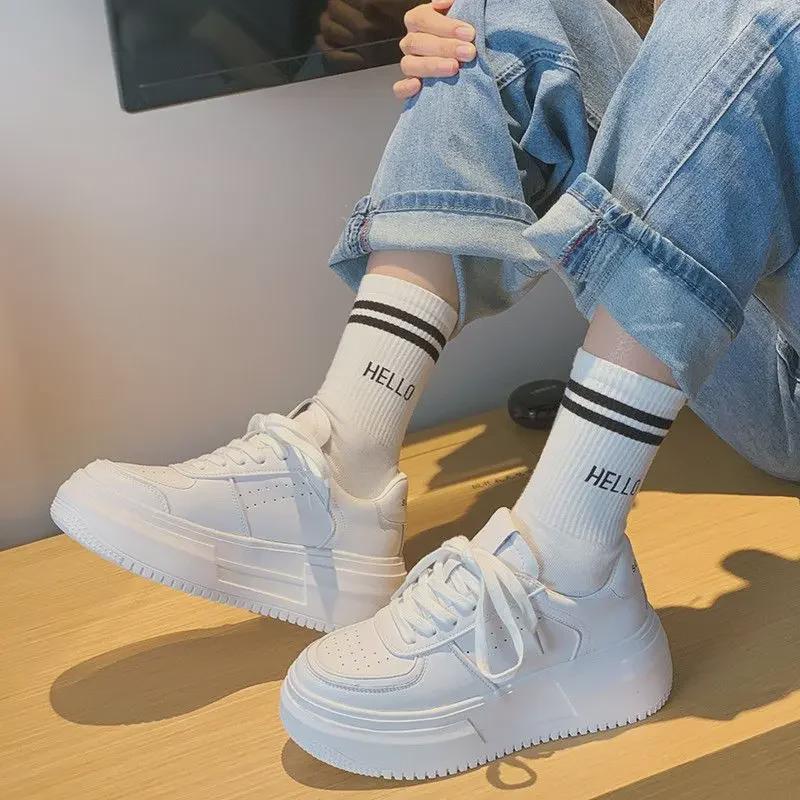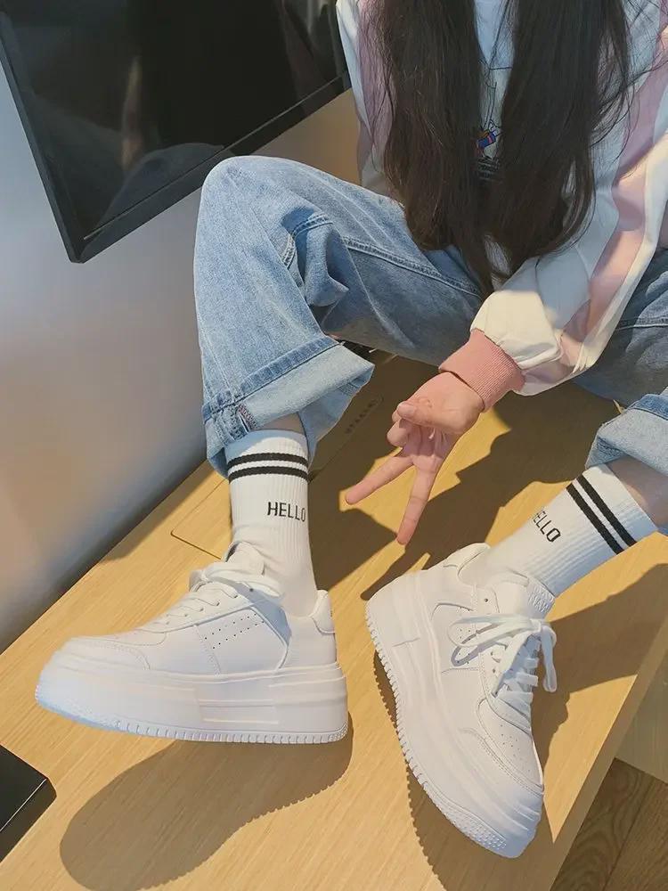 Женские летние белые кроссовки на толстой подошве со шнуровкой и платформой 2023 года — новая корейская мода, спортивный стиль с круглым носком