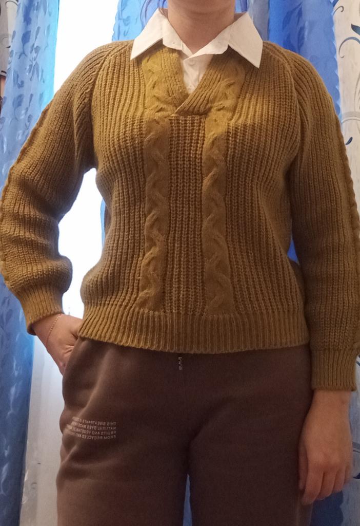 У меня размер 44 (М) рост 162 см, кофта подошла, рукава для меня немного коротковаты, можно смело брать размер XL Дополняю: кофта не линяет, после первой стирки руками в нескольких местах повылазили и поползли нитки