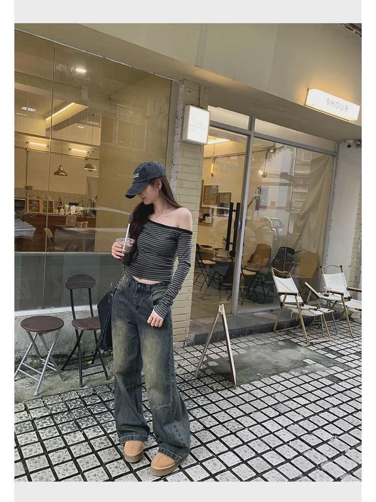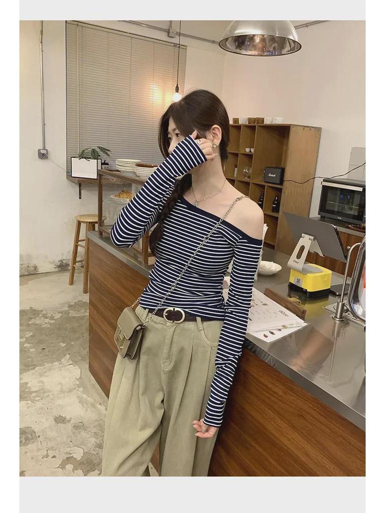 Футболка в полоску серого цвета с открытыми плечами и длинными рукавами для женщин в европейском стиле - Ранняя осень