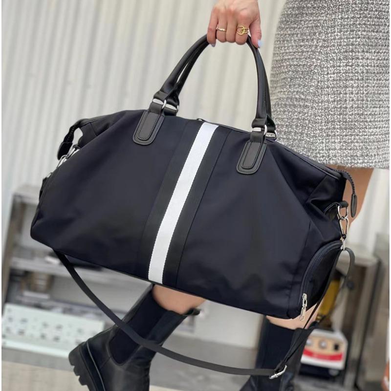 Стильный и практичный дизайн: Эта дорожная сумка, подходящая для людей разного пола, имеет классический черный нейлоновый корпус с заметной белой полосой, проходящей по центру, что создает яркий цветовой контраст.. Кожаные вставки на ручках и ремешке добавляют нотку изысканности..