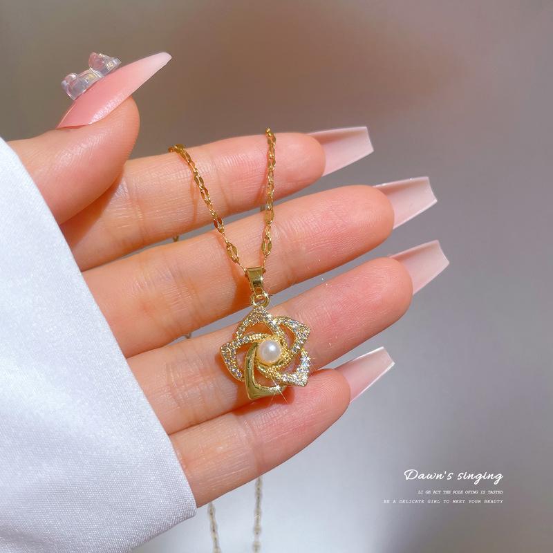 Вращающееся ожерелье из титановой стали с винтажными цветами для женщин, медная микроцепочка на ключицу, цепочка на свитер, зеленый циркон