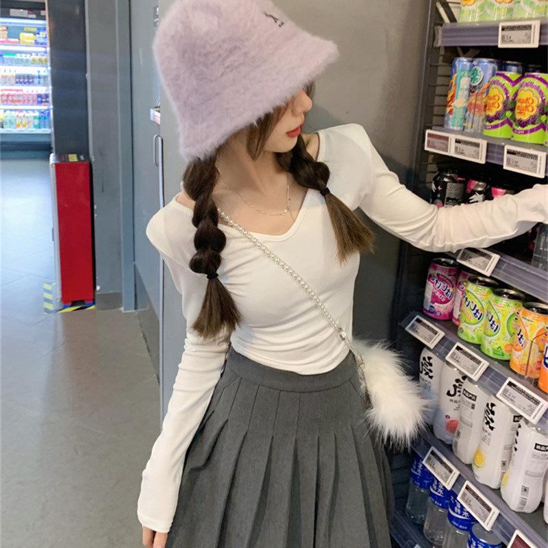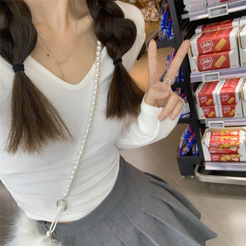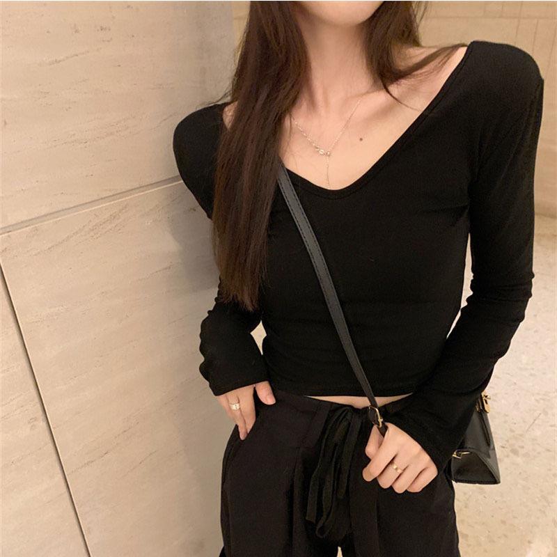 Женская футболка с V-образным вырезом, однотонная, с длинным рукавом, дизайн для ранней осени, облегающая, короткий топ, трендовая