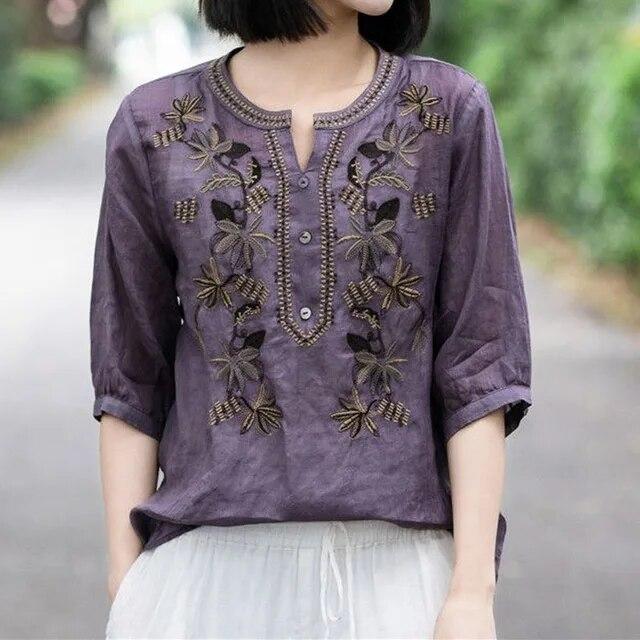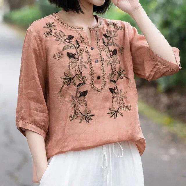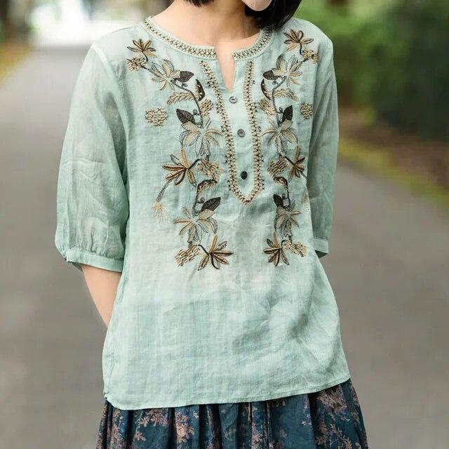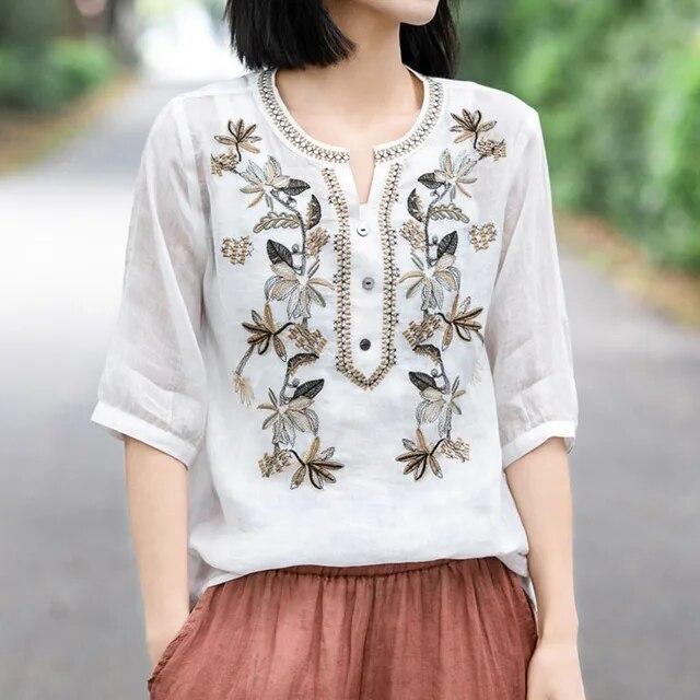 Винтажная модная однотонная рубашка с вышивкой, летняя женская одежда, свободная универсальная блузка с v-образным вырезом и половиной рукавов, женская