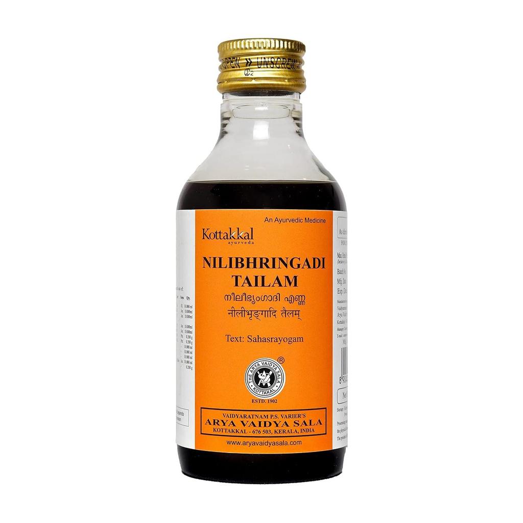 Kottakkal Ayurveda Nilibhringadi Tailam хорошо подходит для глубокого питания волос и регулирования их качества.. Помогает предотвратить чрезмерное выпадение волос, появление секущихся кончиков и ломкость волос, а также детоксифицирует кожу головы, сохраняя ее здоровой.. В состав входит брингарадж — трава, которая естественным образом укрепляет волосы, придает им упругость и делает их более устойчивыми к окрашиванию и термической обработке.. В состав также входит Яшти, который стимулирует рост волос, снимает инфекции кожи головы и улучшает качество волос.