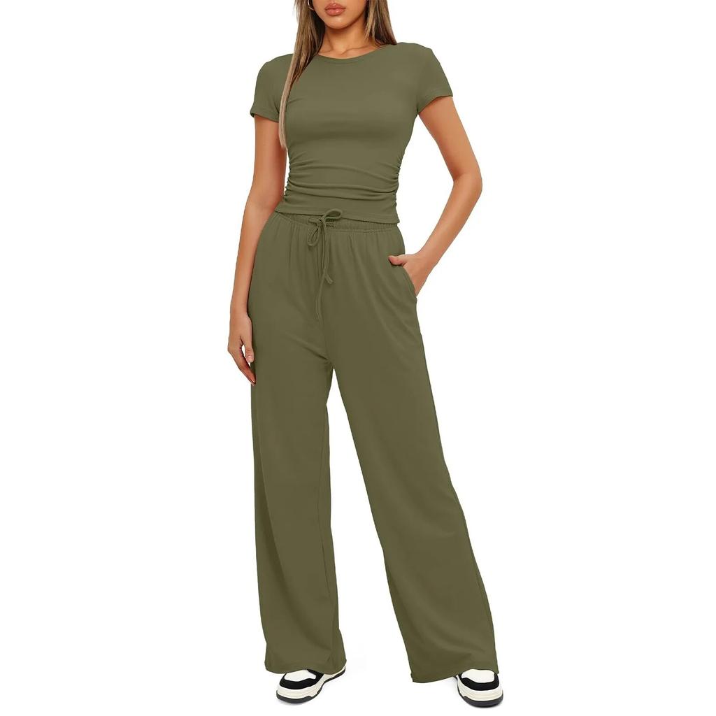 Женские комплекты из 2 предметов. Комплекты для отдыха. Топы с короткими рукавами и рюшами и широкие брюки с высокой талией. Спортивные комплекты.