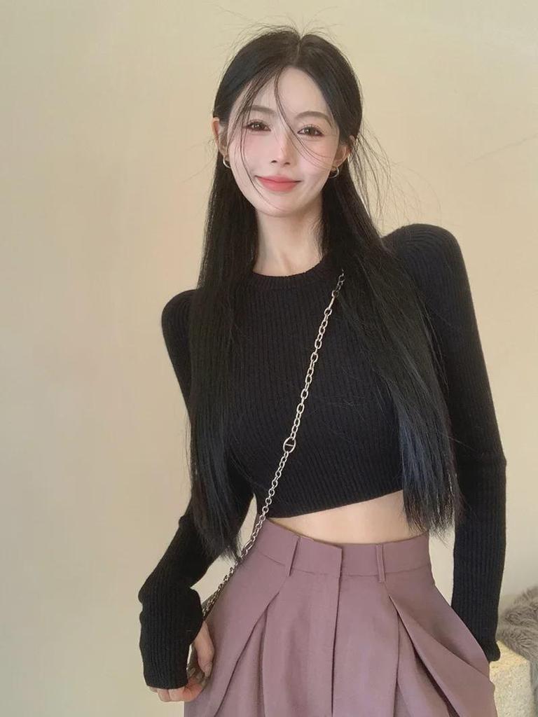 Черный укороченный трикотажный свитер с длинными рукавами для женщин - облегающий топ осень/зима 2023 года