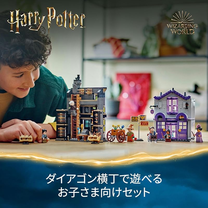 Давайте создадим Косой переулок — магазин Олливандера и магазин одежды в стиле вестерн мадам Малкин можно соединить вместе, а также можно весело провести время, создавая городской пейзаж Косого переулка, комбинируя их с продаваемым отдельно набором «Коллекция Косого переулка.уксус».