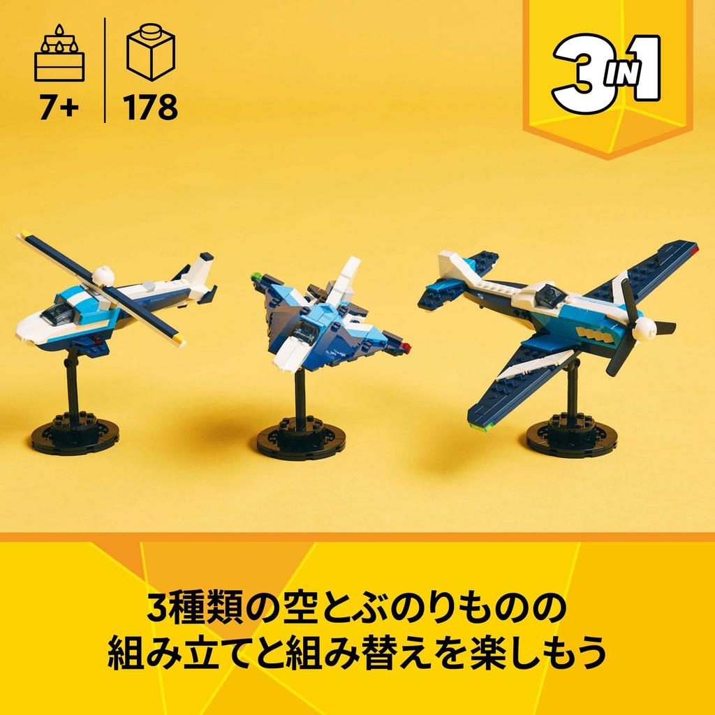 Летательный аппарат Lego Creator: Воздушный гонщик (31160) имеет вращающиеся пропеллеры и может передвигаться по земле с помощью движущихся колес. Закончив играть, вы можете выставить его на специальную подставку, собранную из блоков, и наслаждаться видом классного дисплея.. (Целевой возраст: и выше) Из 1 набора можно собрать 3 типа летательных аппаратов.. Вы можете собрать и продемонстрировать на стенде гоночный самолет с вращающимися пропеллерами и колесами, реактивный самолет с движущимися колесами или вертолет с вращающимися роторами.. Этот конструктор рекомендуется детям, которые любят создавать полные действий истории в своих фантастических мирах.. Серия LEGO Creator 3in1 поддерживает детское творчество, позволяя им получать удовольствие от многократной сборки и перестановки трех разных моделей в одном наборе.. У нас есть богатый ассортимент, который позволяет детям погрузиться в создание всего, что им нравится, включая скоростные транспортные средства, диких животных и реалистичные кукольные домики.. (уведомление: 3 типа моделей не могут быть собраны одновременно)