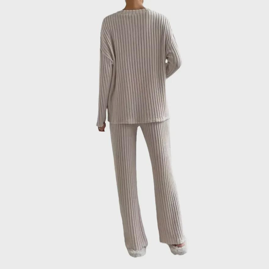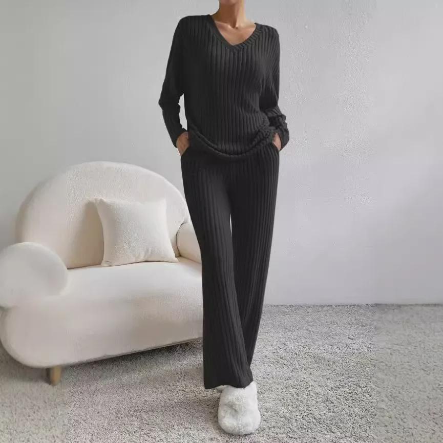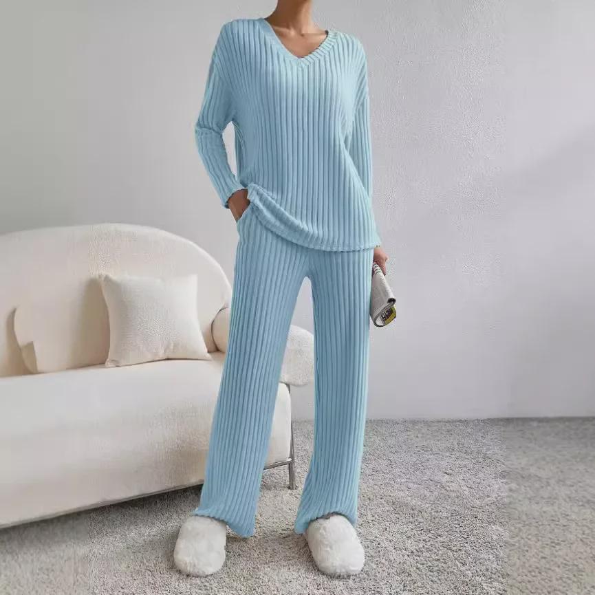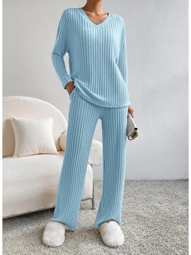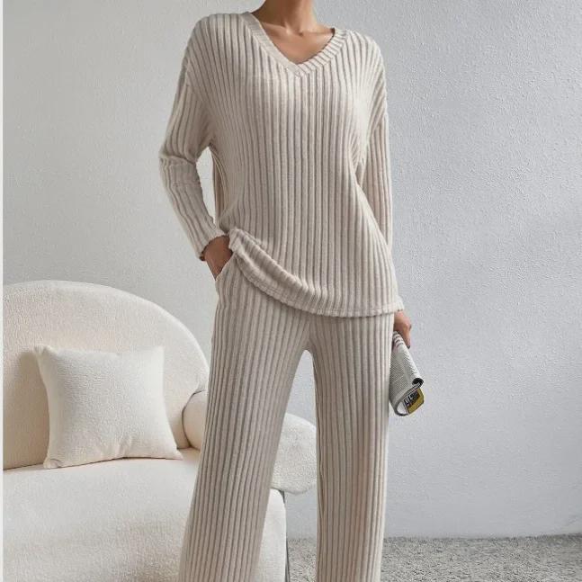 Женская осень 2024 Трансграничная мода: Трикотажный полосатый костюм с V-образным вырезом и прямыми брюками