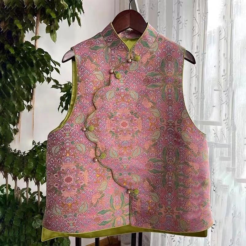 «Женская жилетка с асимметричным воротником и розовым принтом 2024 года в китайском стиле, идеально подходит для весны, осени и зимы»