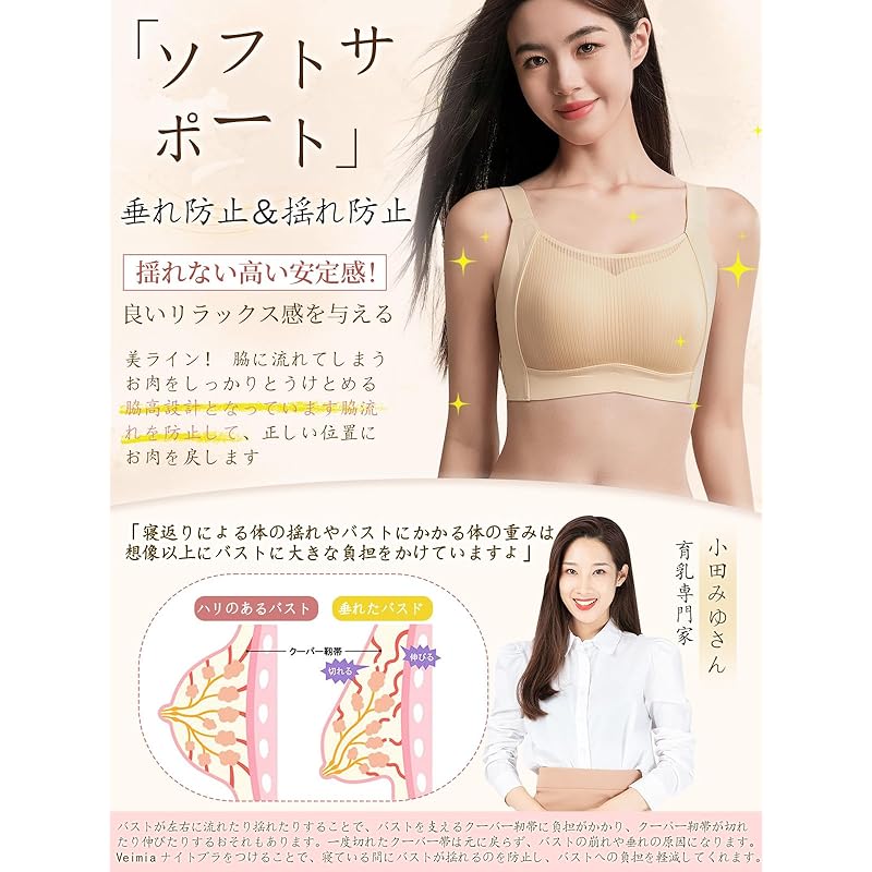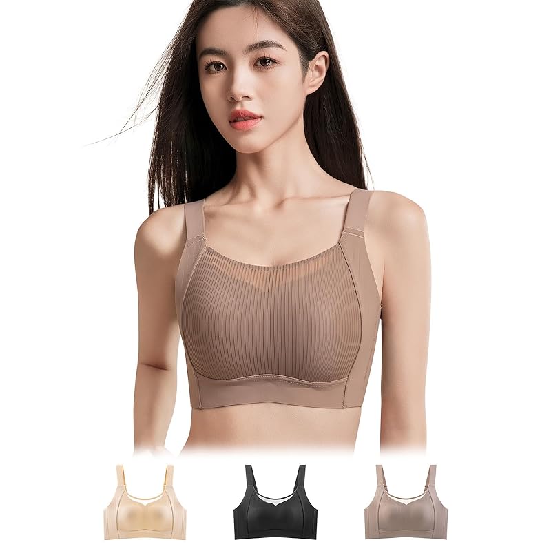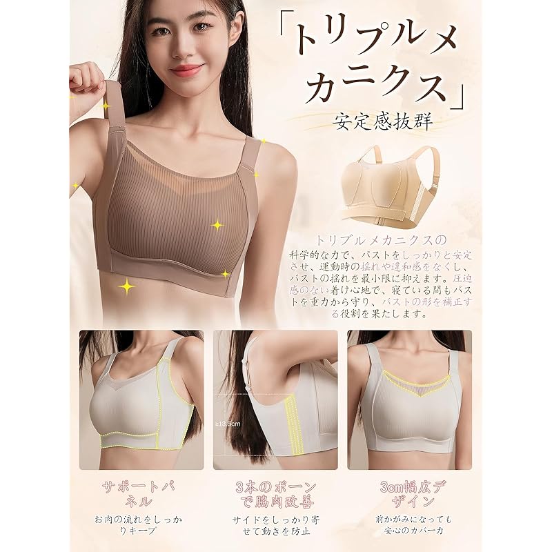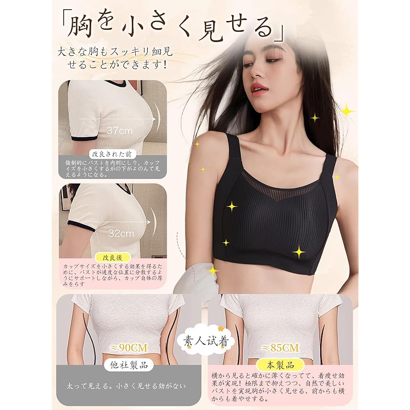 [Отличная удерживающая способность с тройной устойчивостью] Надежная поддержка с 3 точек: бретели, под грудью и на спине. Бюст сохраняет устойчивость даже при интенсивных движениях, уменьшая смещение и тряску. Как «бюстгальтер, который визуально уменьшает грудь», который комфортно поддерживает ваши ежедневные движения, он также обеспечивает чувство безопасности для тех, у кого большие размеры.