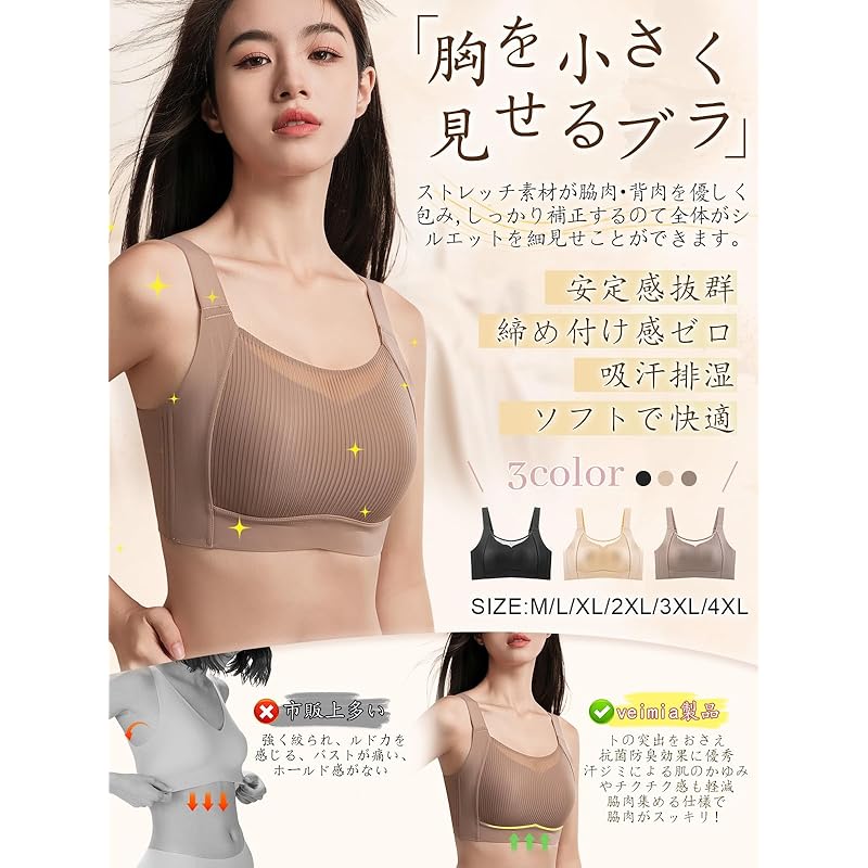 [Дизайн, который визуально уменьшает грудь] Этот «бюстгальтер, который визуально уменьшает грудь» имеет высокую конструкцию подмышек, чтобы надежно скрыть жир в подмышечных впадинах. Он создает естественный силуэт, позволяя вам выглядеть стройнее, просто надев его. Идеально подходит для обтягивающих топов и платьев, делая ваши повседневные наряды более стильными.