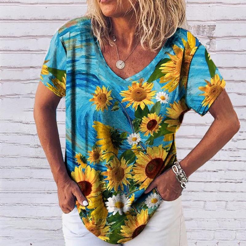Летняя женская футболка свободного кроя с цветочным принтом и V-образным вырезом, короткими рукавами