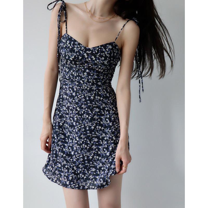 Платье с цветочным принтом Xiao Zou Ju, облегающее бедра, для женщин, летнее, сексуальное, с глубоким вырезом, на бретелях, А-образная юбка, короткая юбка, пляжная юбка