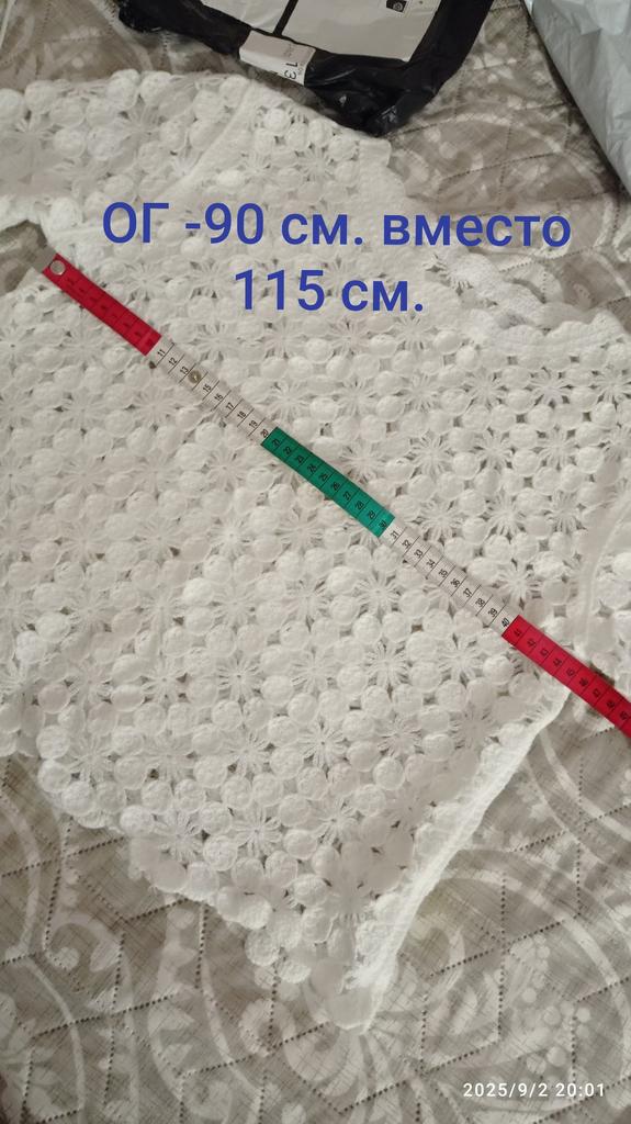✳️Хочу поделиться с вами печальным опытом покупки этой красивой ажурной кофточки! Кофточка, на самом деле, замечательная💓! Белоснежная, с красивым вязаным ажуром и выглядит, как на фото продавца!!! Но.... Она пришла оооочень маленькая! Параметры сильно отличаются от размерной таблицы продавца! Я это сразу поняла, когда вытащила её из посылки! Налезла она на меня, благодаря ажурному рисунку, такие вещи имеют свойство растягиваться, но где я, и где кофточка, которую прислали😉🤨! ?Фото с замерами выставила! Мои параметры 102/82/102! Чтобы вещь сидела, как на модели, надо иметь 40 размер!!! Обидно, конечно, месяц ждать и получить сюрпиз 🤨от продавца! Само изделие красивое! Связано из приятных ниток, по ощущению, что это хлопок, но это такая синтетика. Выглядит кофточка нежно и нарядно! Не было никаких ярлыков и каких либо опознавательных знаков с информацией об изделии. Такое впечатление, что вязала китайская бабушка😉😄в каком то подвале! Но связала хорошо, аккуратно, вот если бы ещё и сантиметры довязала, как положено, было бы вобще замечательно 👍👍👍! Конечно же, я обратилась в СП‼️И большое им спасибо за то, что быстро отреагировали и вернули мне стоимость моей неудачной покупки! Ну а дальше, так как терять мне было уже нечего,я решила попробовать растянуть кофту паровым ударом утюга! И у меня получилось! 👏👏👏Она стала шире и длиннее! Длина стала 54 см, а ОГ почти 100 см!! И кофточка уже нормально села на меня, даже слегка свободно,засчет того, что рукава и плечи были даже чуть больше,вцелом, носить теперь,вполне,можно.Приобретала я её, чтобы накидывать на мои комбезы, под сарафаны, ну и просто потому, что она мне понравилась 😄💓💗!! Но это очередной печальный опыт покупки товара без отзывов. Наступапаю на одни и теже же грабли😉!!! Но хорошо, что всё хорошо закончилось для меня на этот раз. Но рекомендовать к покупке ,конечно,не буду!Хотя, возможно, это был один экземпляр, который достался мне и всем остальным придёт товар соответствующий! Но это уже риск! Стройным девочкам можно брать и не бояться! Кофточка очень милая💓💗😍🙌