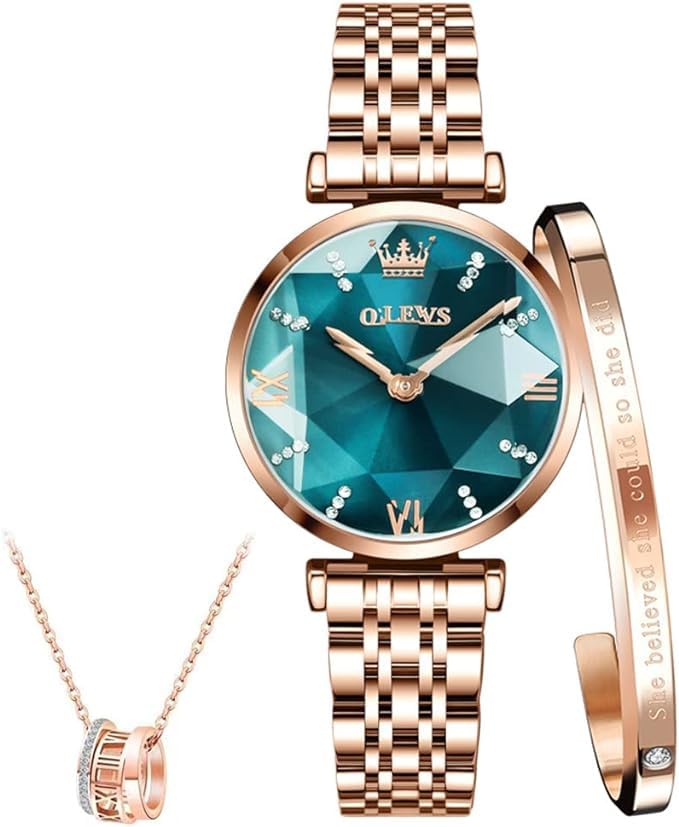 OLEVS Популярные часы + браслет: Кожаный колокольчик и простой циферблат, прочный и дышащий ремешок очень популярен благодаря своему сверкающему блеску, а часы имеют простой дизайн большого циферблата, который облегчает считывание показаний.. Классический деловой стиль, модный и повседневный, подходящий для любого случая.