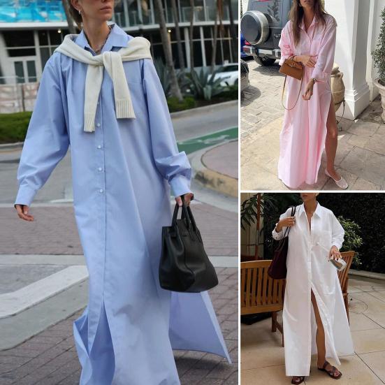 Женское платье-рубашка с лацканами, длинным рукавом, боковым разрезом, повседневная рубашка, однотонное платье макси с застежкой на пуговицы, повседневная одежда — купить товар онлайн с бесплатной доставкой до всему миру!