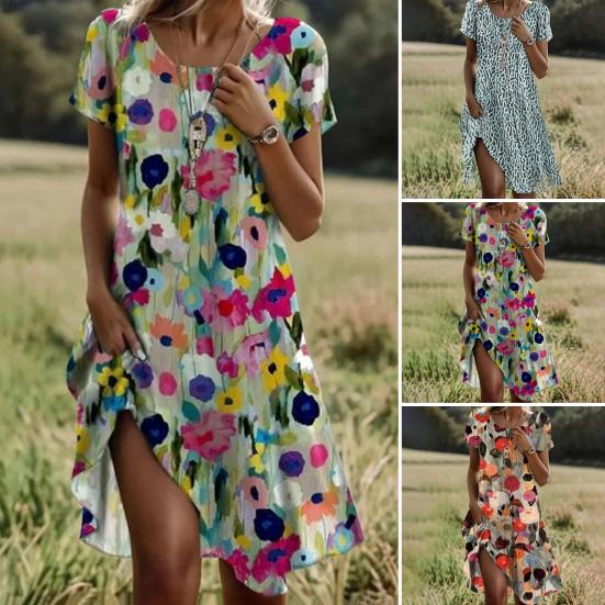 Это женское платье изготовлено из мягкого и легкого полиэстера, имеет свободный покрой и обеспечивает максимальный комфорт.. Круглый вырез и длинная юбка создают стройный и модный образ, идеально подходящий для повседневной носки.. Свободный крой обеспечивает удобную посадку, а принт добавляет нотку стиля..