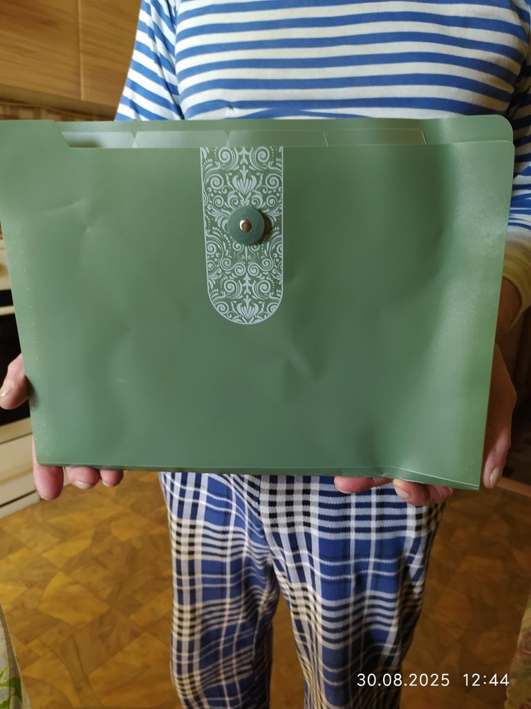 Папка для документов А4 гармоника с 12ти отделениями. Раньше брала папки такие в длину документов. Теперь взяла в ширину. Очень удобное хранение. Можно хранить квитанции, документы, рисунки. Эта пришла немного замятая. Надо положить под груз для исправления.