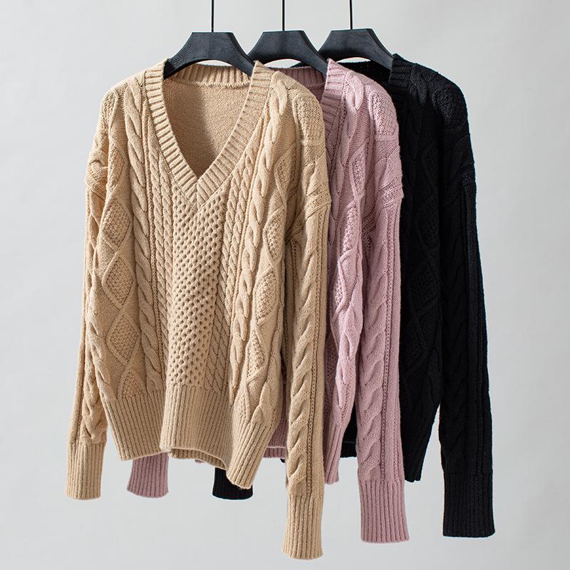 Осенне-зимний женский трикотаж с V-образным вырезом, свободный однотонный свитер с переплетенными нитками