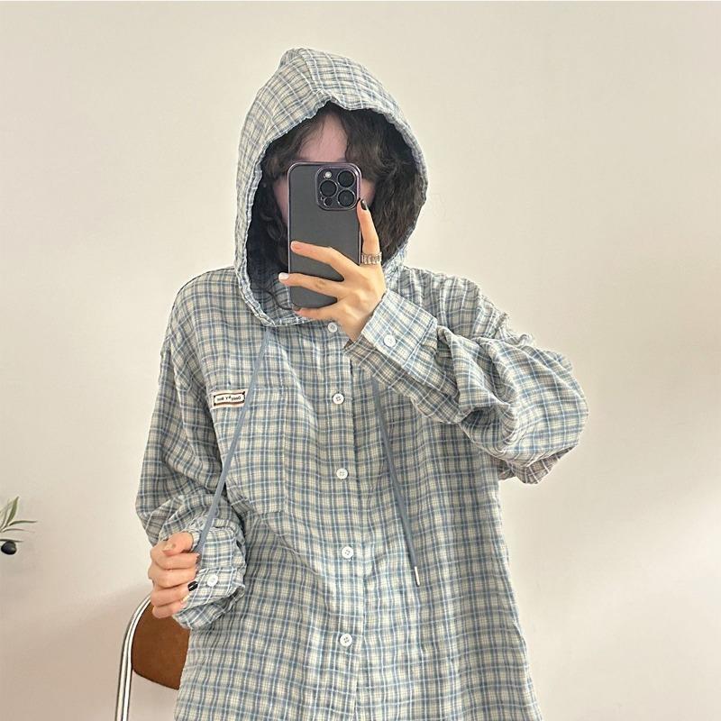 Женская модная клетчатая рубашка с капюшоном, весенне-осенняя, свободного кроя, с длинными рукавами, в корейском стиле, трендовая, универсальная, женские блузки