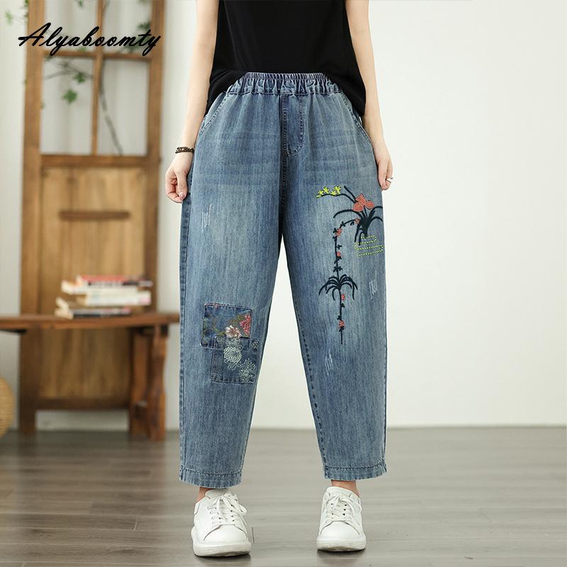 Корейский стиль весна-лето женские джинсы с цветочной вышивкой эластичный пояс повседневные свободные синие джинсовые брюки элегантные женские джинсы-шаровары с карманами — купить товар онлайн с бесплатной доставкой по всему миру!