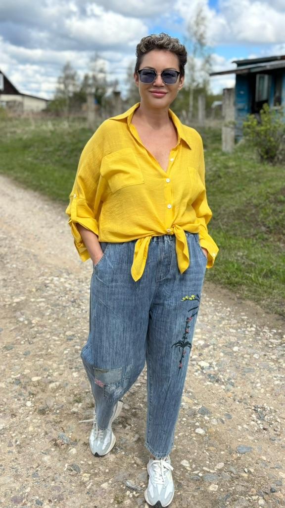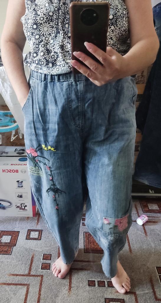 Летние шаровары с вышивкой и заплатками в стиле пэчворк ✔️Размеры М-2XL Мои параметры: 167, 98-85-100 На мне размер 2XL В талии и бедрах джинсы сели свободно, можно было взять на размер, или даже два размера, меньше ✔️Фасон: Высокая посадка На талии резинка Сзади кокетка и два накладных кармана Боковые карманы глубокие На одной штанине машинная вышивка На второй штанине заплатки ✔️Ткань: Легкая, летняя джинса Не тянется ✔️Пошив фабричный ✔️Замеры: ОТ 66-106 ОБ 126 Высота посадки 35 Длина внутреннего шва 57 Длина 92 Ширина брючины внизу 20 Ширина брючины в районе бедра 35