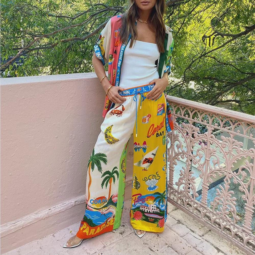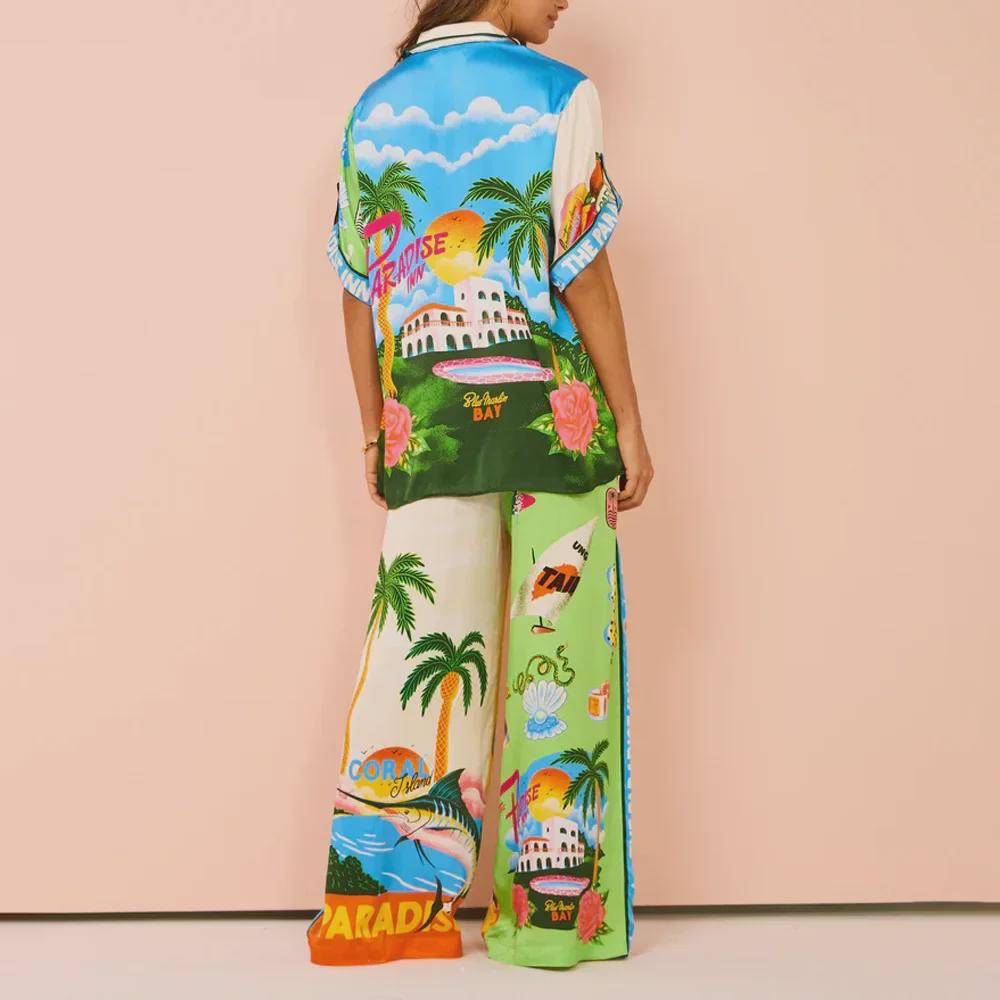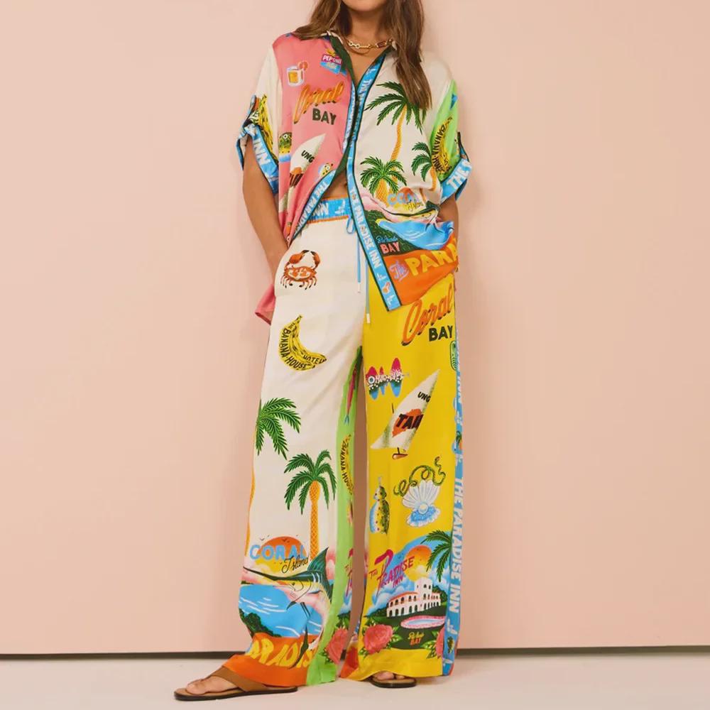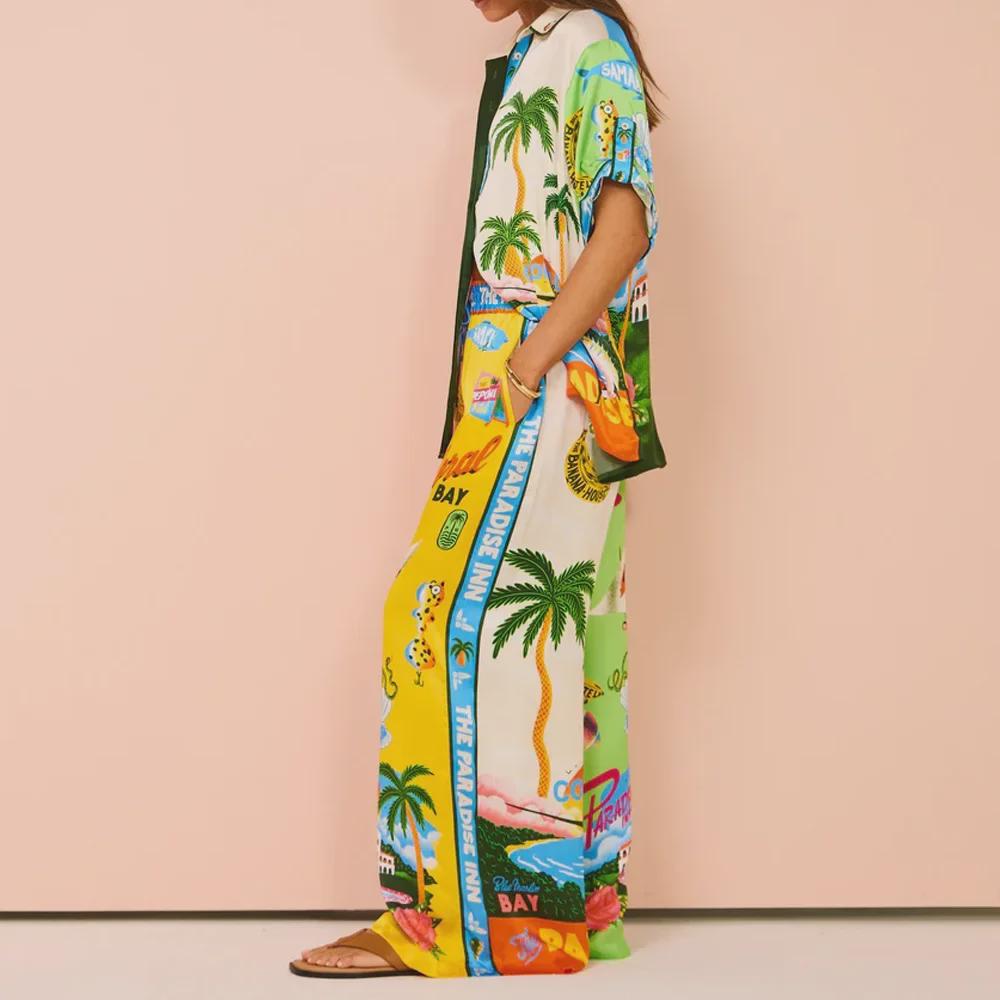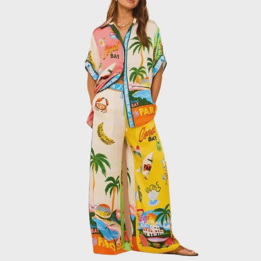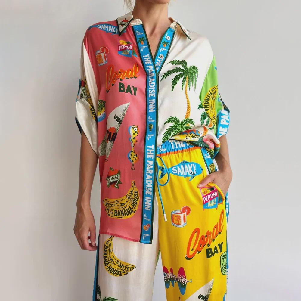 Лето 2024 г. Свободная женская рубашка с принтом и брюки в европейском и американском стиле, повседневный комплект из двух предметов.